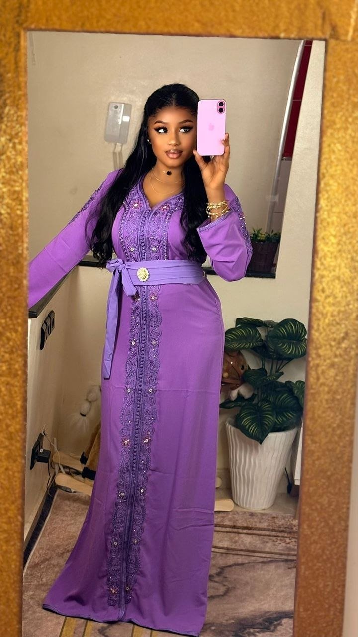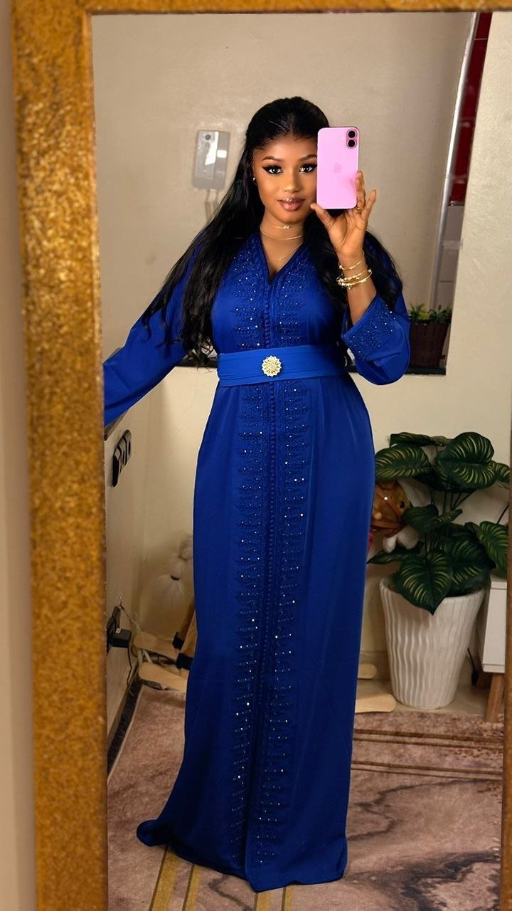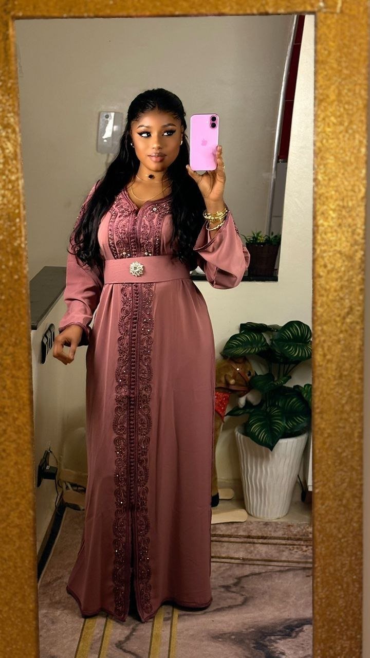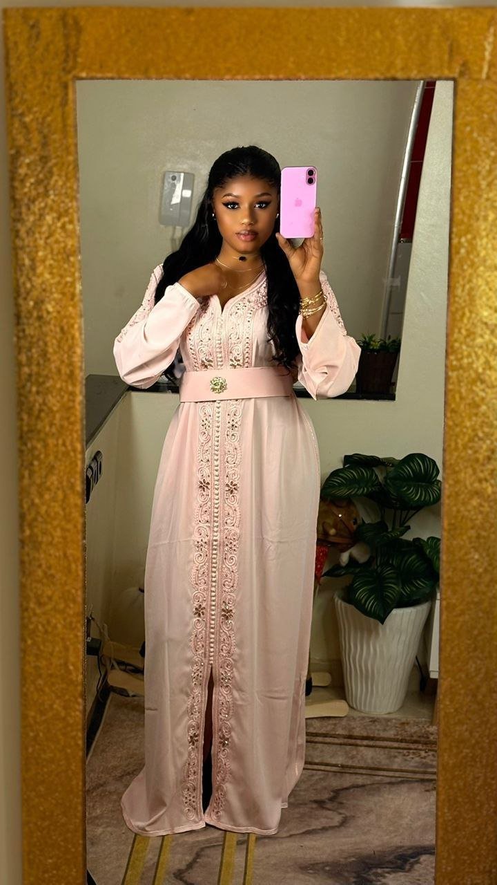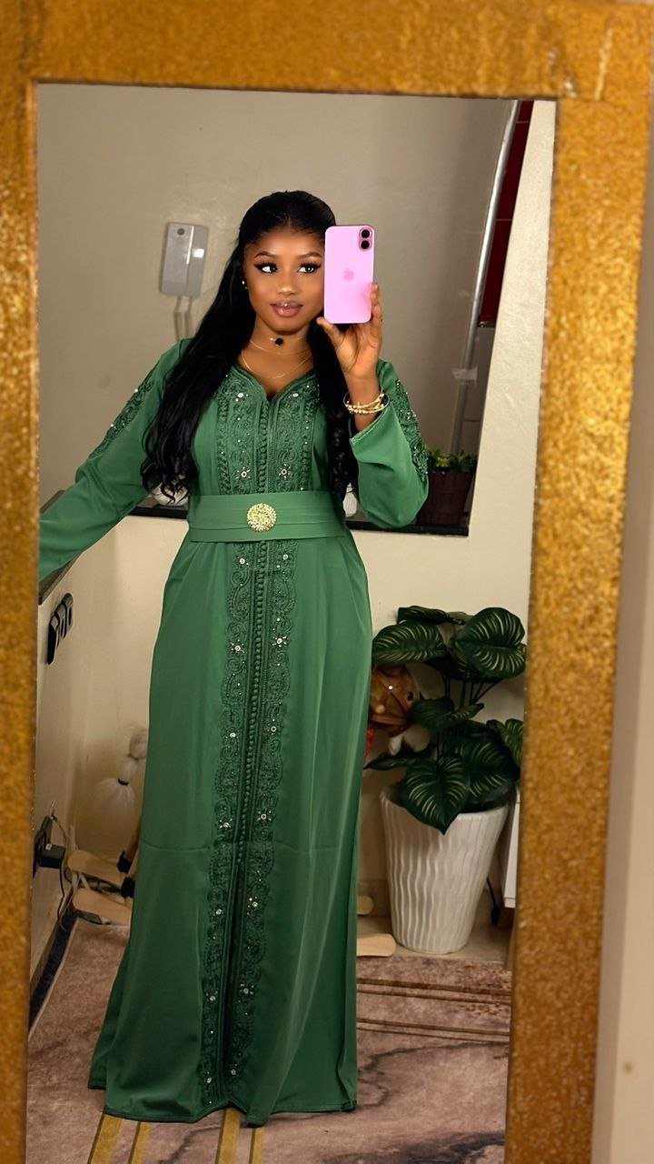 Ce caftan long et élégant se distingue par son travail entièrement réalisé à la main. Il est orné de broderies fines et de détails délicatement cousus, mettant en valeur un savoir-faire artisanal exceptionnel. Sa coupe fluide est sublimée par une ceinture qui marque la taille, apportant une touche raffinée et harmonieuse. Un modèle chic et authentique, parfait pour les grandes occasions.
