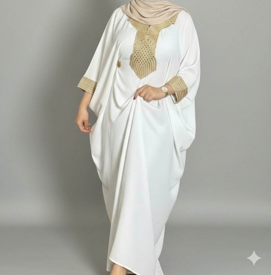 Gandoura femme marocaine élégante de couleur blanche, conçue dans une coupe ample et confortable. Elle se distingue par ses broderies raffinées dorées au niveau du col et des manches, apportant une touche traditionnelle chic. Idéale pour un style à la fois moderne et pudique, parfaite pour les occasions ou le quotidien.